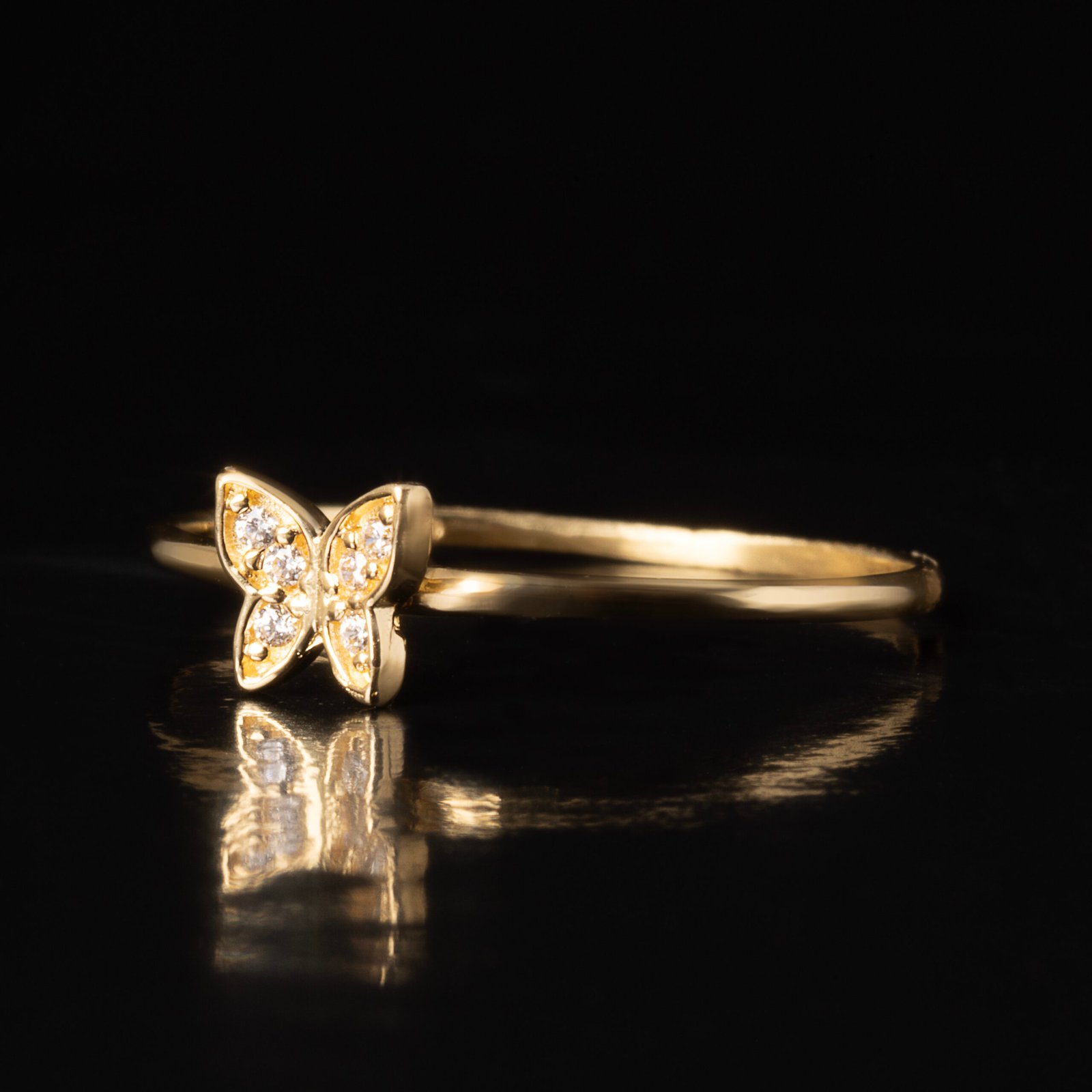 Anel em ouro 18K com borboleta ornamentada por zircônias cintilantes. Combina delicadeza e brilho, oferecendo um visual romântico e sofisticado em uma peça leve e elegante.