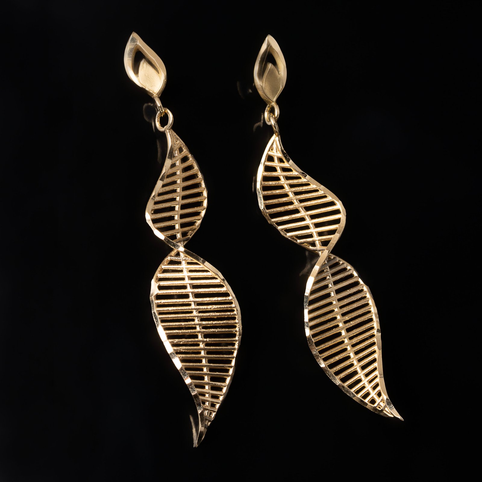 Par de brincos em formato de folha, confeccionados em ouro 18K, com acabamento polido e design inspirado na natureza. Possuem largura aproximada de 1 mm e altura de 4 mm, oferecendo visual alongado e proporções equilibradas. Peso aproximado de 2,5 g, podendo variar conforme o processo de fabricação. Peça resistente e indicada para uso diário.